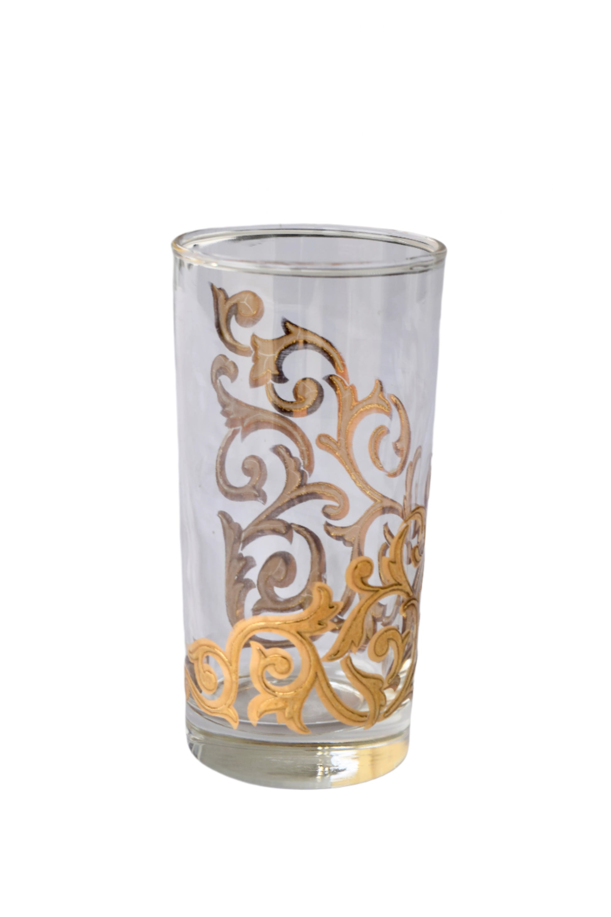 A decorative highball glass featuring elegant gilt scroll work in the style characteristic of luxury glassware producers Culver and Georges Briard, representing the sophisticated barware popular during the mid-century entertaining era.