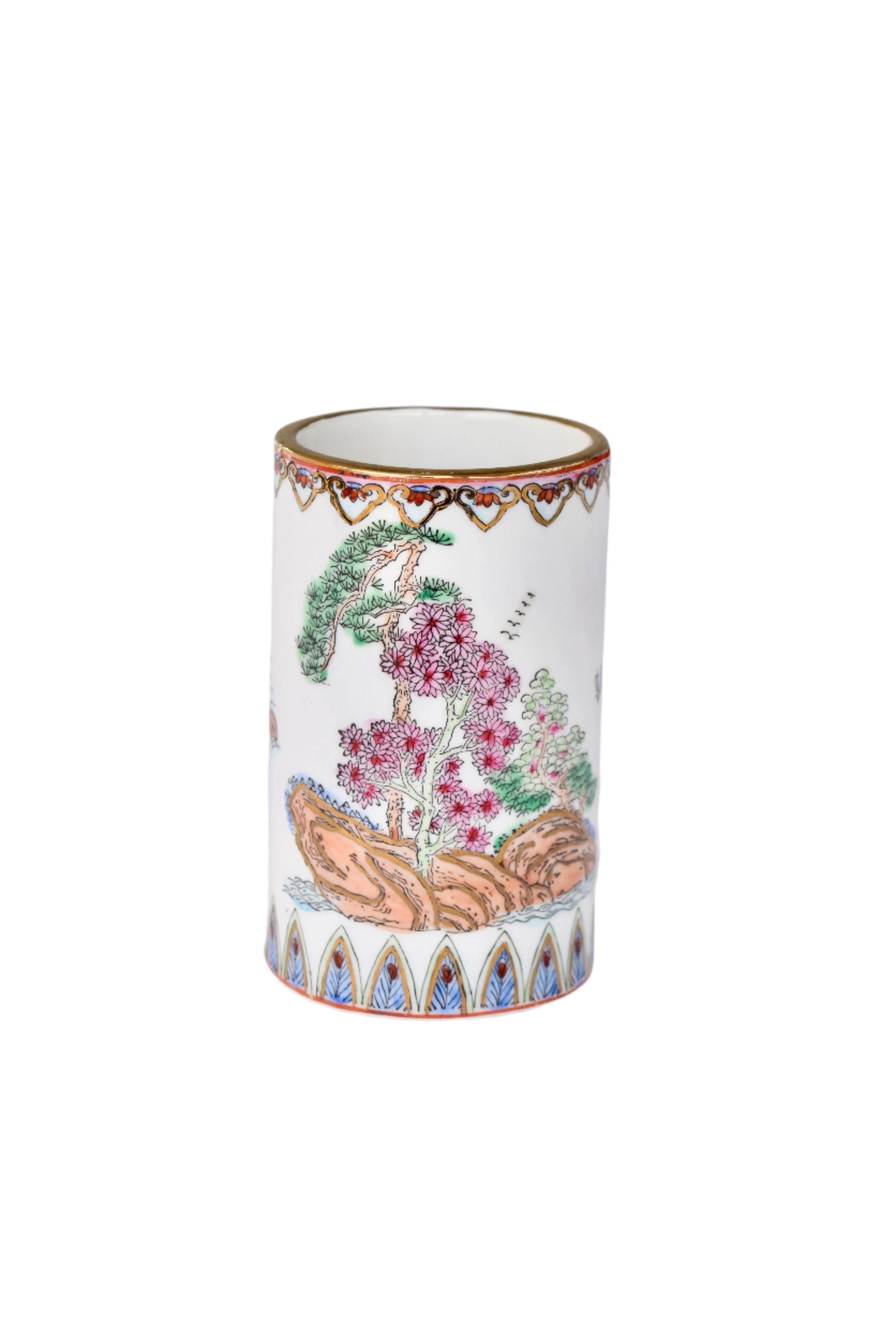 A modern Chinese porcelain cylinder vase featuring a traditional landscape scene with flowering trees and rocks, demonstrating the continuation of classical Chinese decorative motifs in contemporary production.