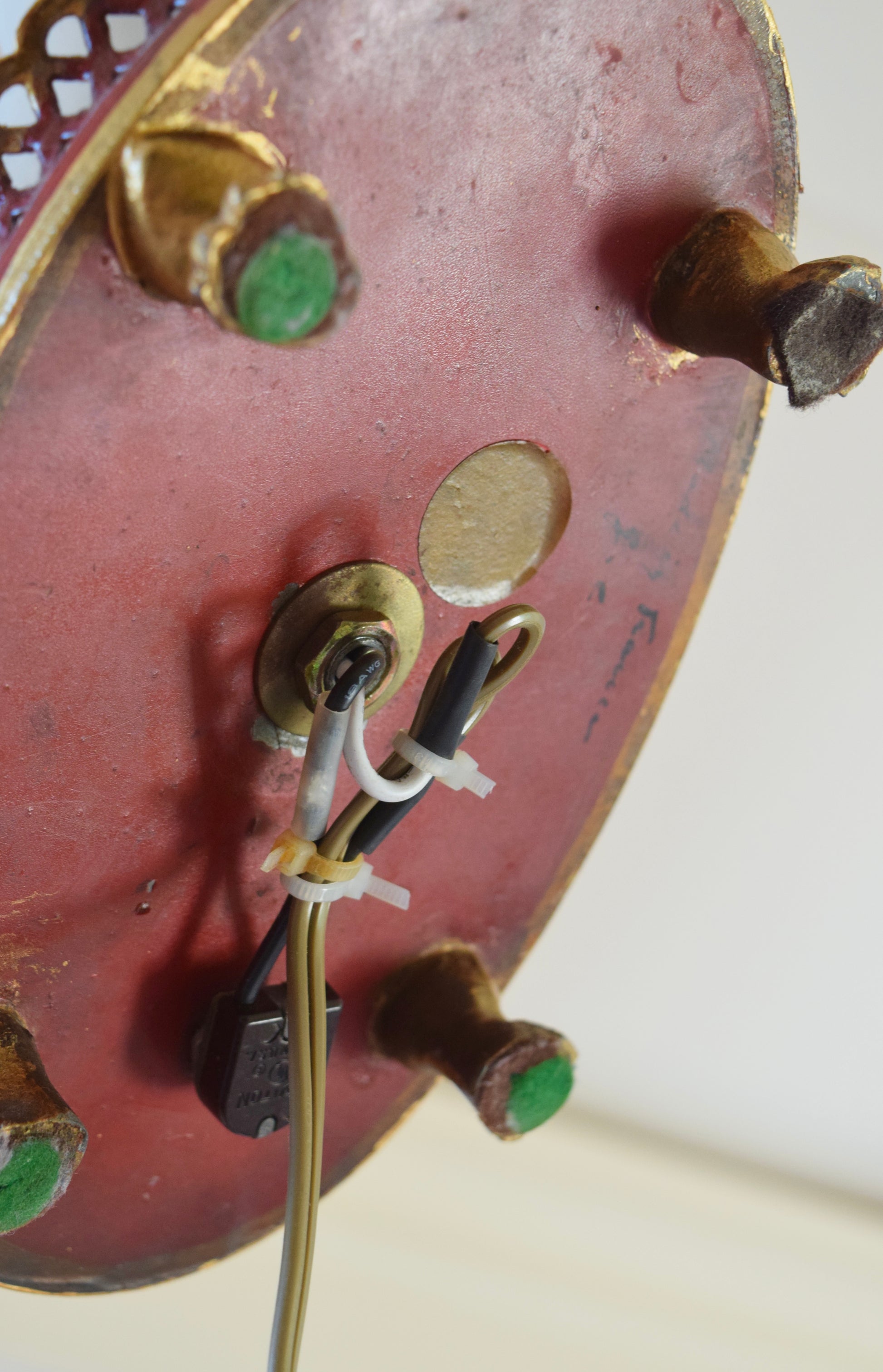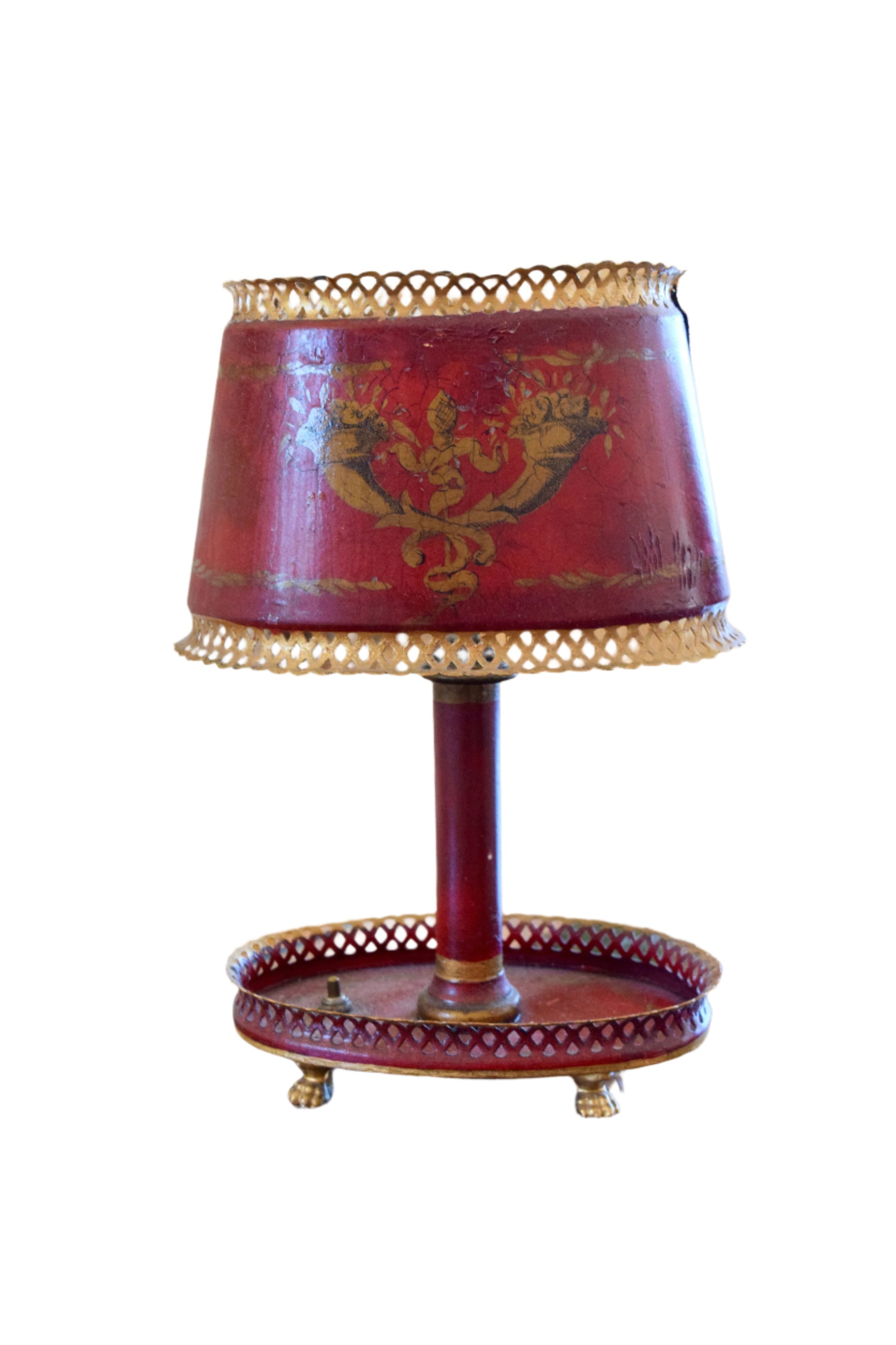 The tôle peinte technique used in this lamp was a highly regarded French metalworking craft, involving hand-painting sheet metal to create durable, decorative objects. The burgundy color scheme and classical motifs are characteristic of the Empire style's interpretation of ancient Roman designs.