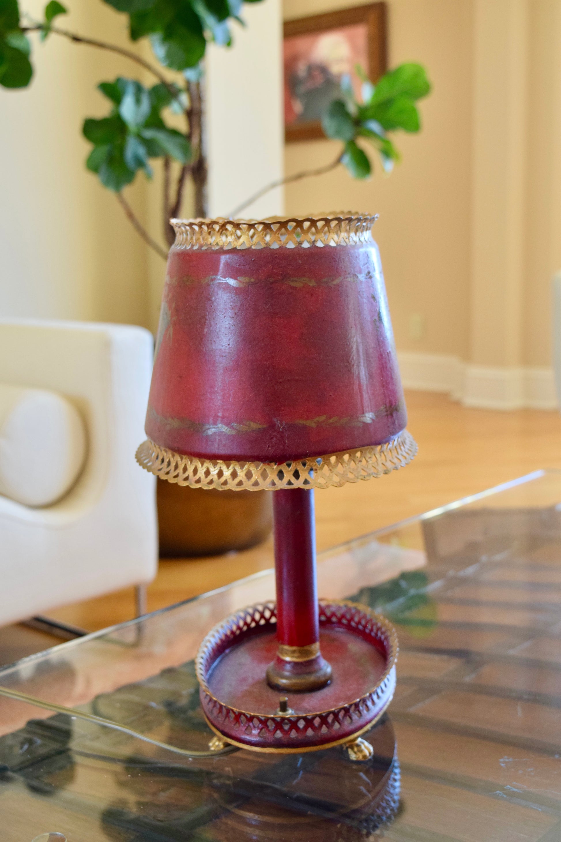 An elegant French Bouillotte table lamp exhibiting classic Empire style characteristics, featuring a distinctive burgundy tôle peinte (painted sheet metal) shade and base with decorative brass accents. This authentic period piece demonstrates the refined aesthetic that emerged from the French Empire period and remained popular through the early 20th century.