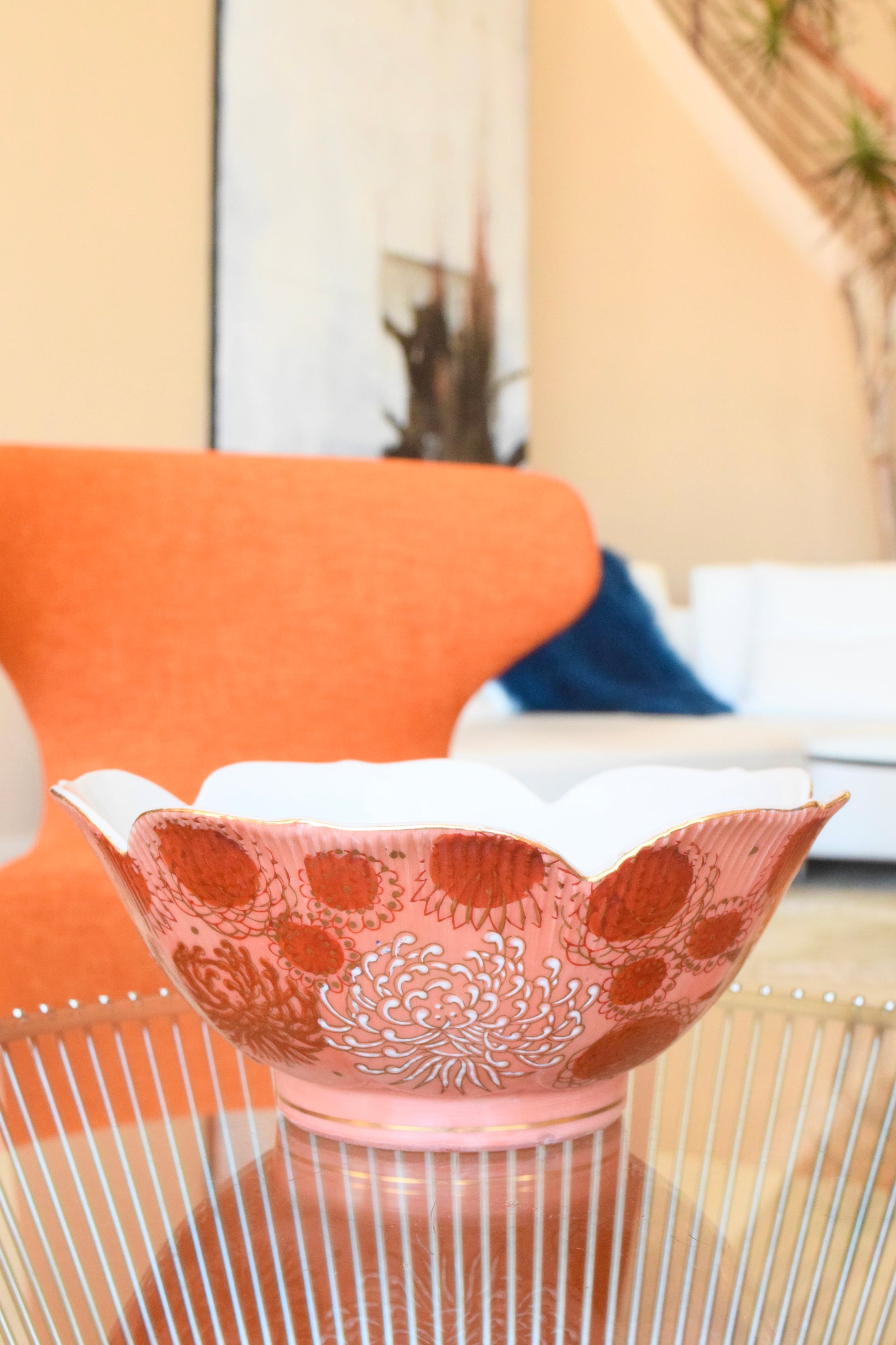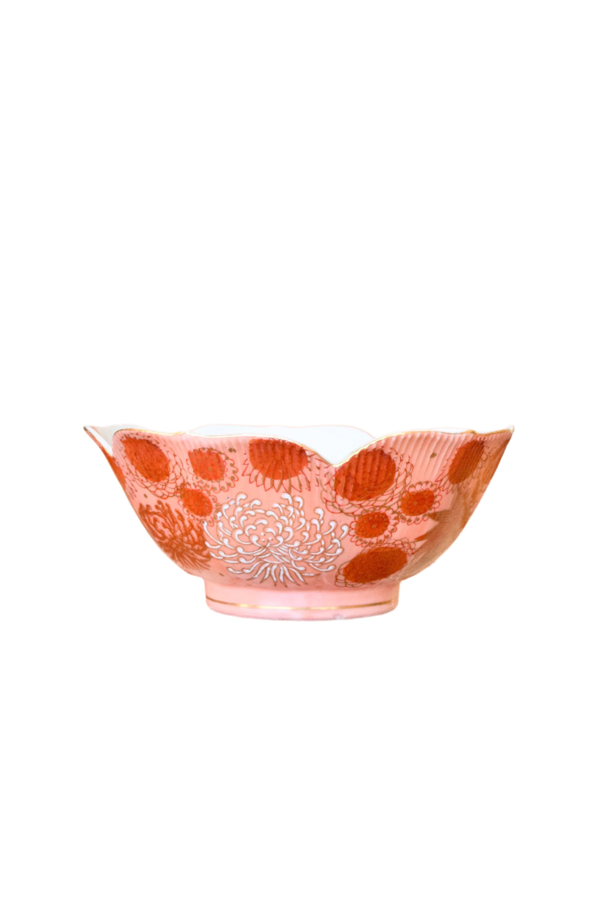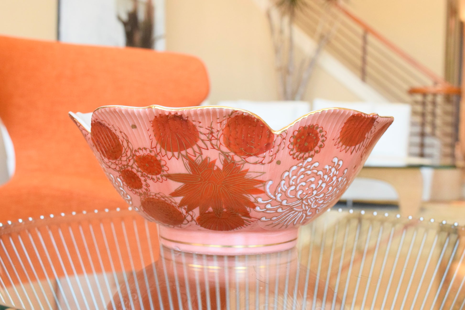An enchanting Mid-Century porcelain bowl by Imperial Ware featuring a soft coral-pink ground with an elegant floral design. The piece showcases a distinctive scalloped rim and masterful combination of white chrysanthemum motifs with darker coral medallions.