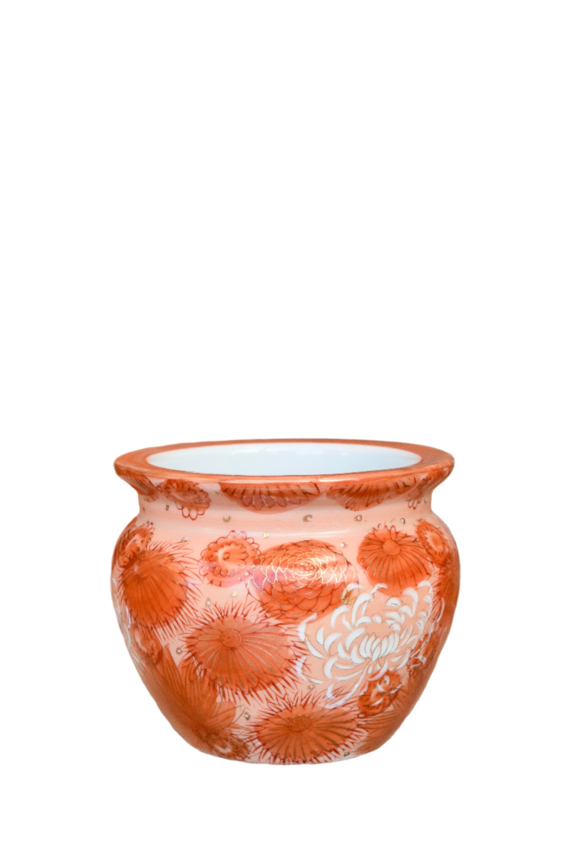 A charming Japanese Kutani porcelain bowl featuring a delicate coral-pink glaze with chrysanthemum design. This mid-century piece showcases the characteristic Kutani style with its vibrant coral coloring and detailed floral motifs.