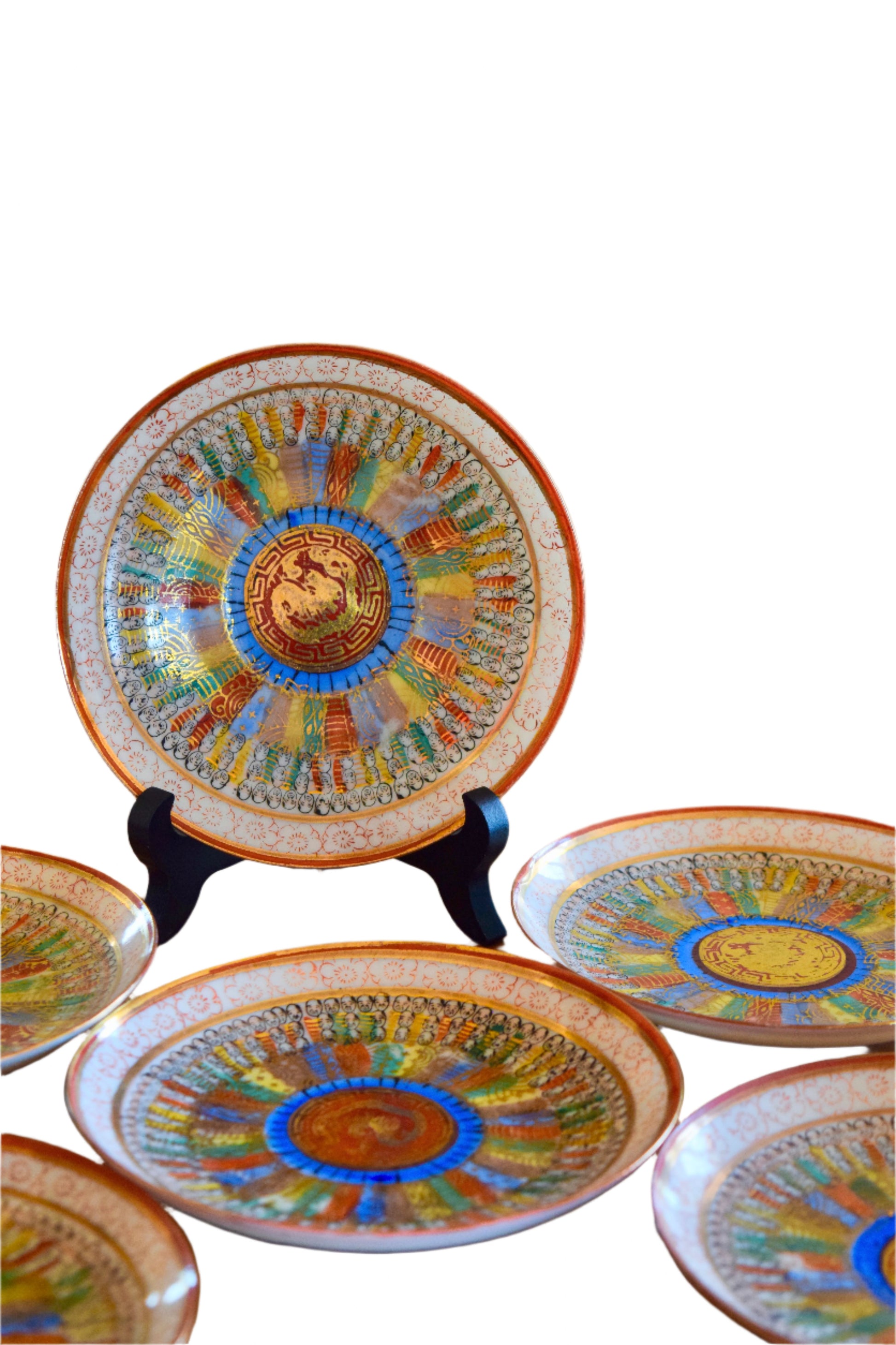 An exquisite set of four Japanese Kutani porcelain plates featuring the rare and intricate "Thousand Faces" (Senmen) pattern. Each plate demonstrates exceptional artistry with a mesmerizing radiating design of individually detailed faces, showcasing the meticulous craftsmanship of Meiji period Japanese porcelain.