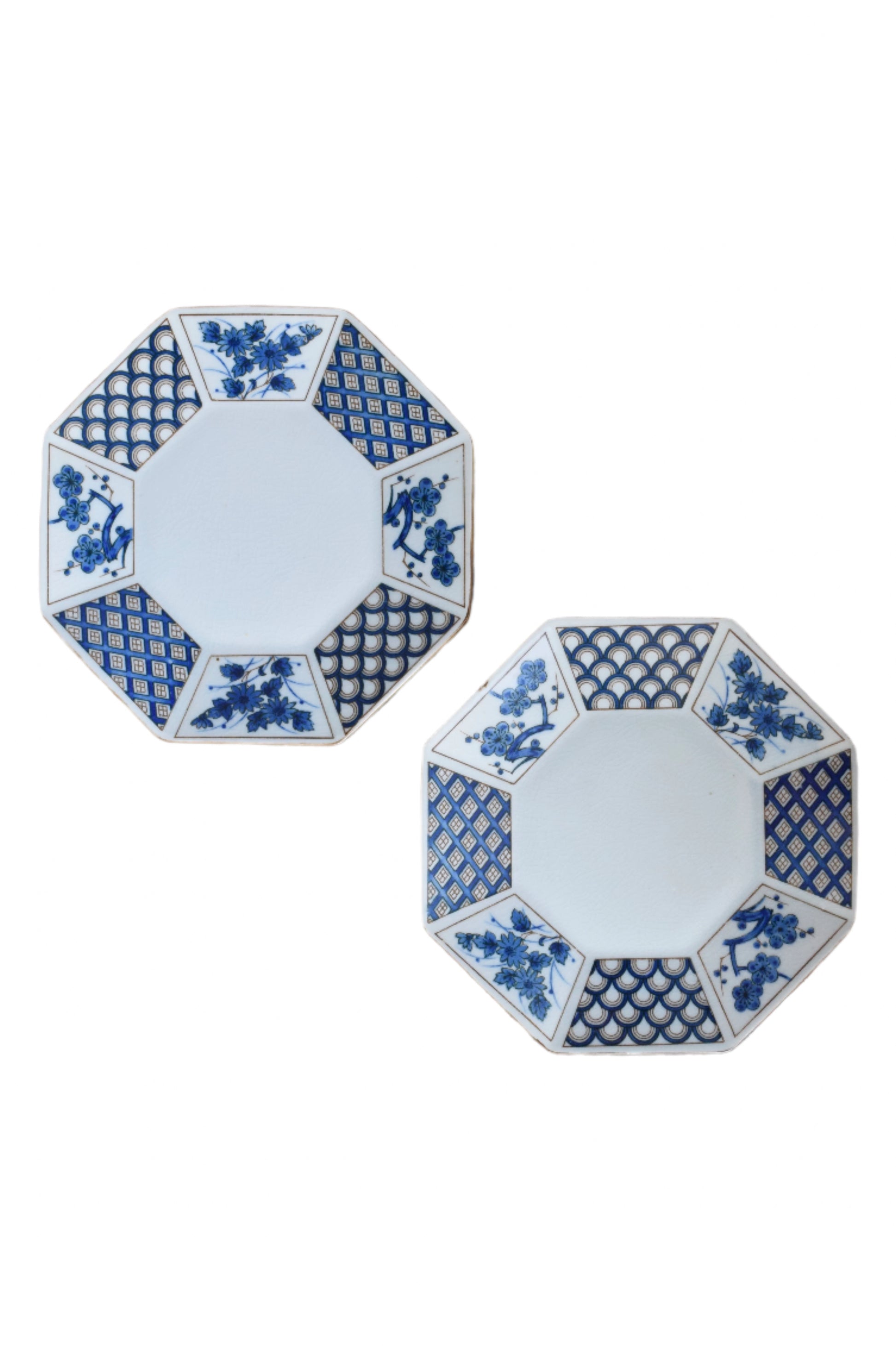 A matching pair of octagonal plates in the Imari tradition, featuring classic blue and white decoration with geometric patterns and sakura motifs, typical of post-war Japanese export porcelain.