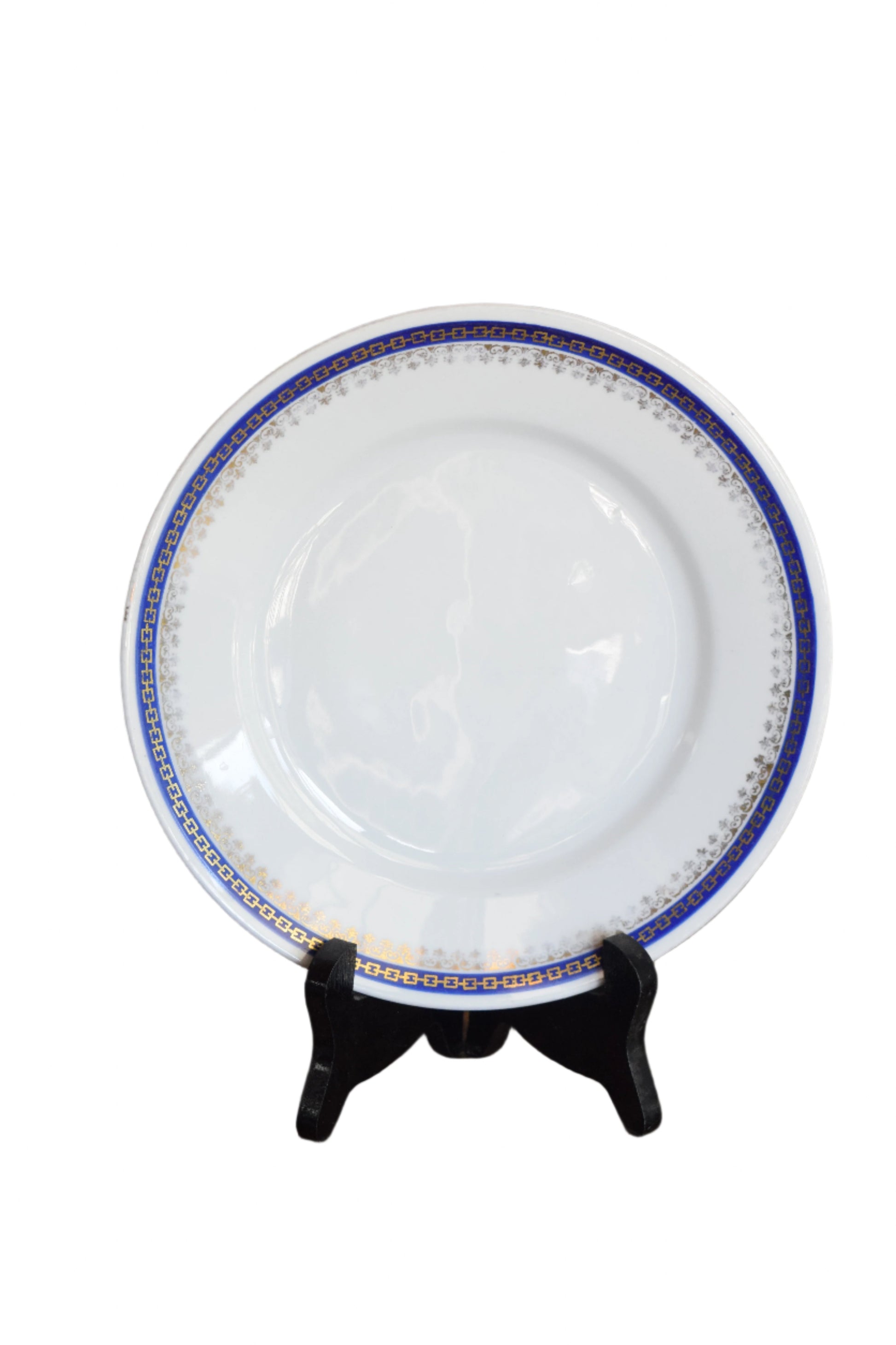 A refined KPM porcelain dinner plate featuring an elegant cobalt blue and gold border design, demonstrating the renowned German manufacturer's commitment to clean lines and sophisticated decoration typical of their early 20th-century production.