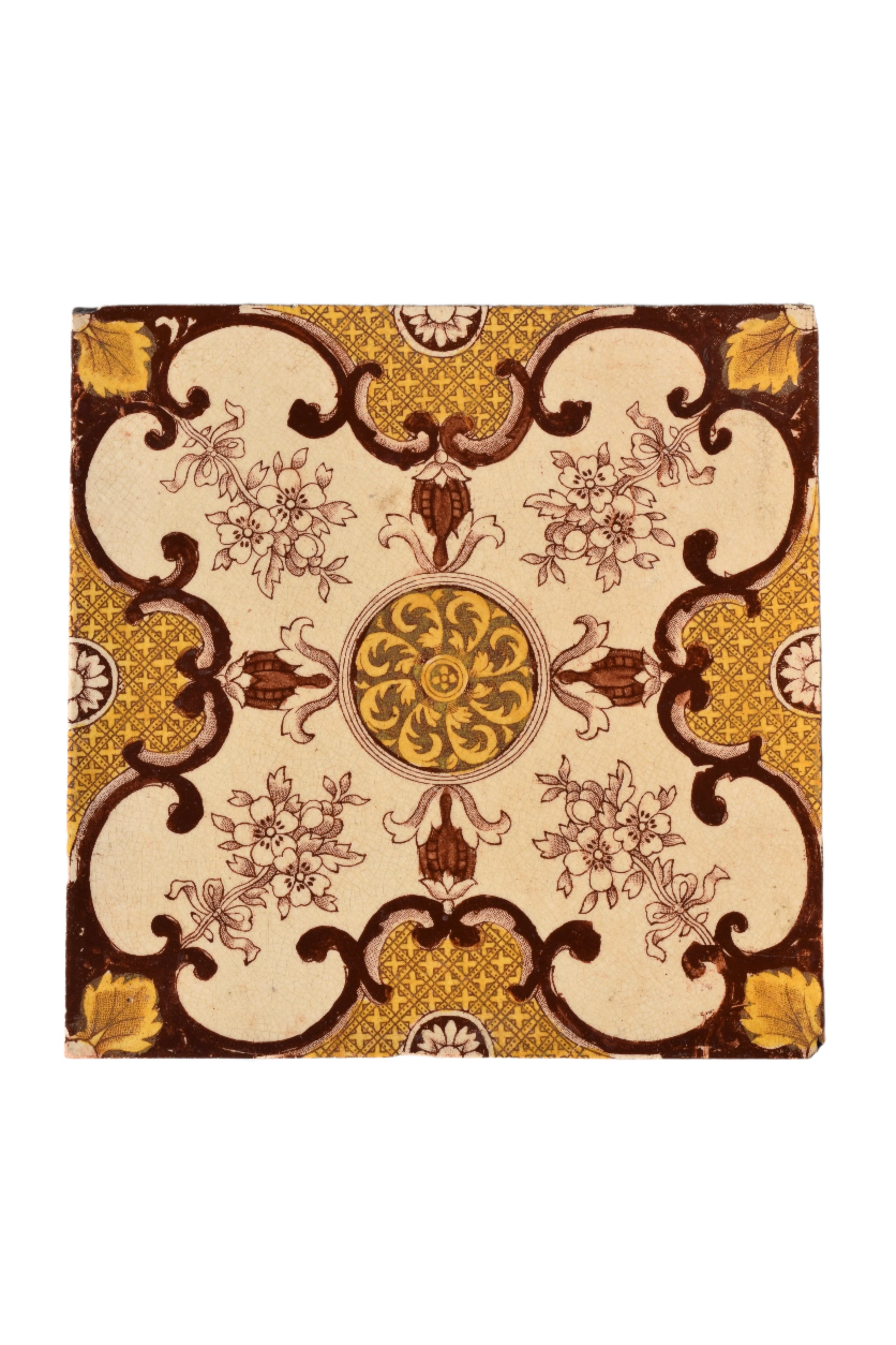 This tile represents the height of Victorian ceramic production when Minton was leading the revival of decorative tile-making in England. The aesthetic movement influences are evident in the combination of naturalistic and geometric patterns.
