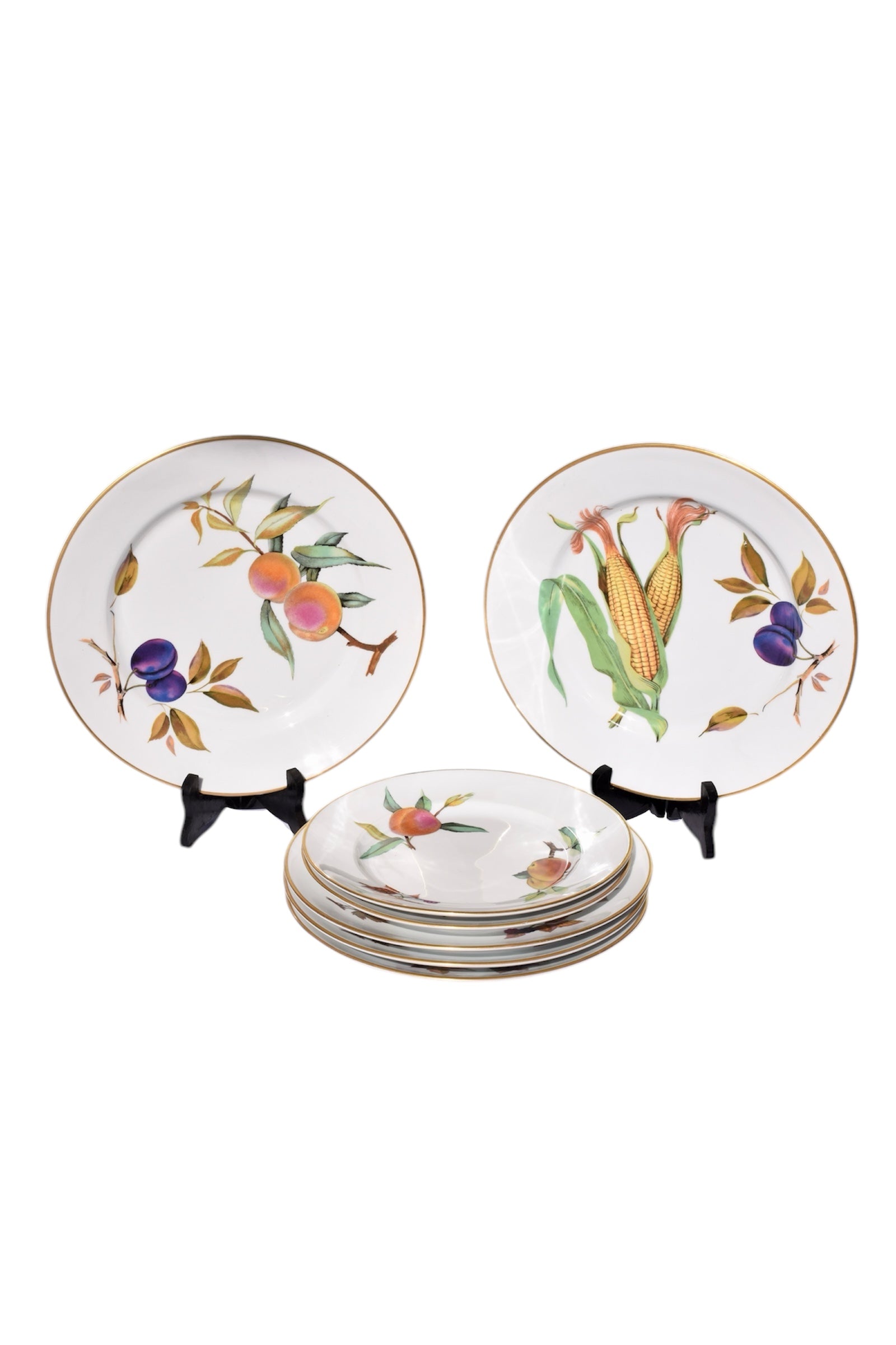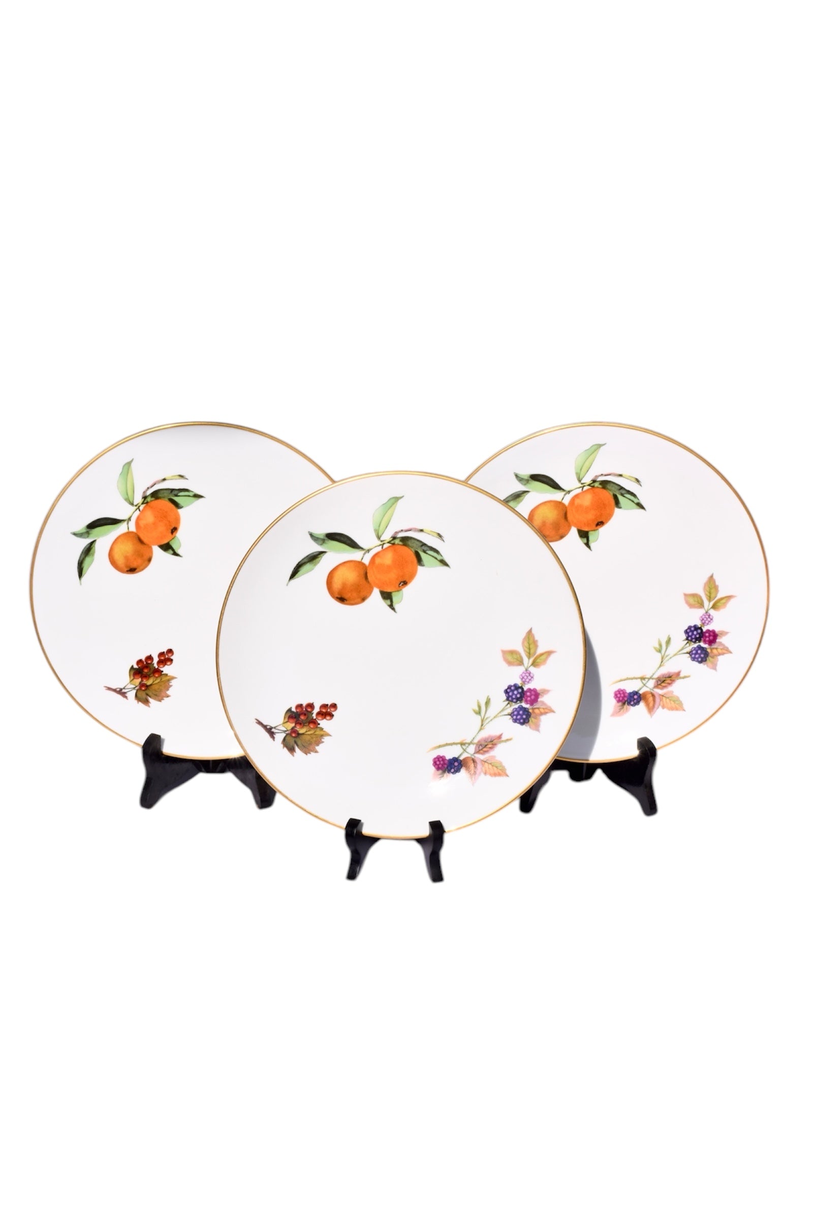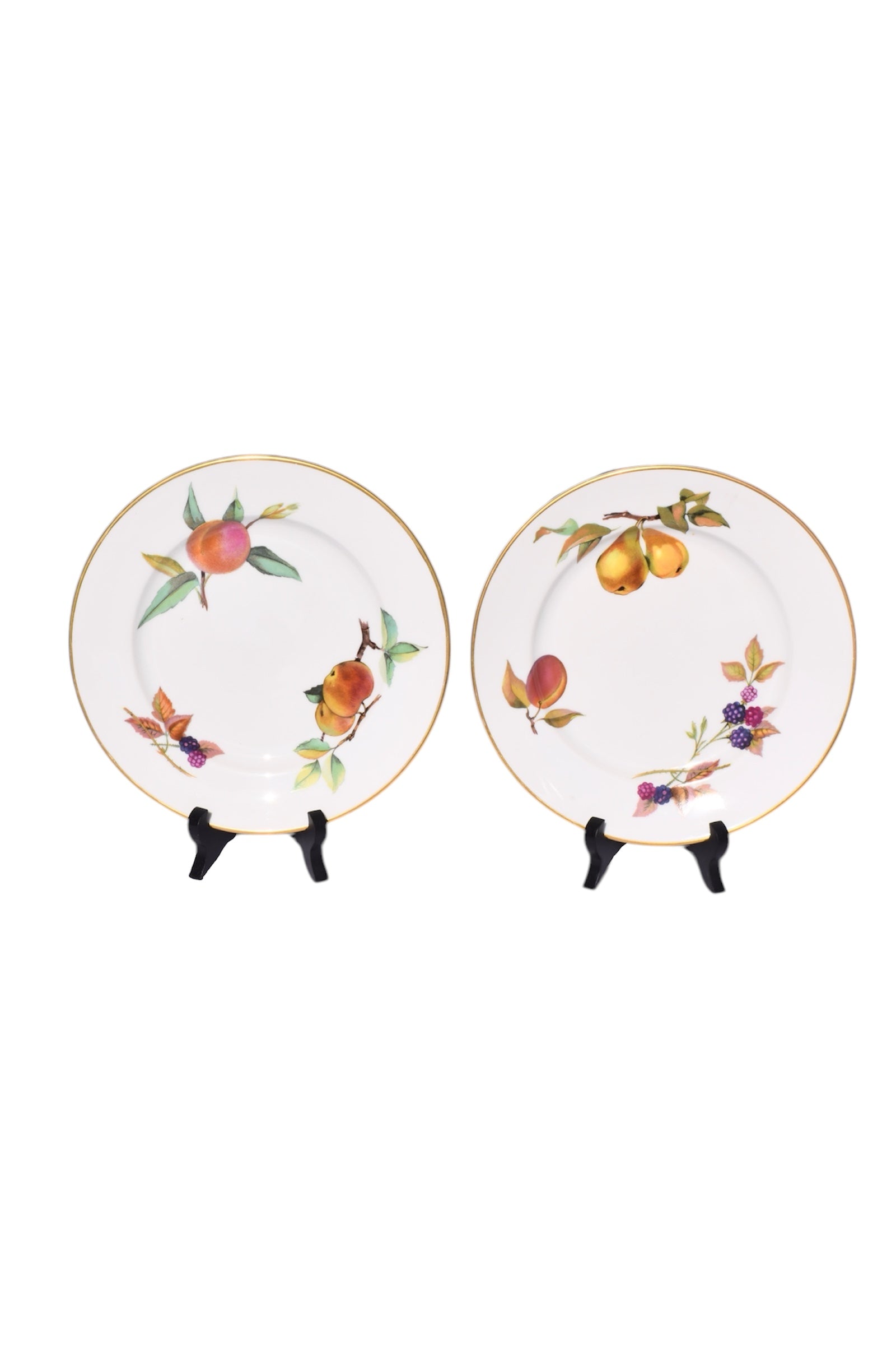 A collection of fine porcelain plates in Royal Worcester's popular Evesham pattern, featuring naturalistic fruit designs that exemplify the company's skilled botanical illustration tradition.
