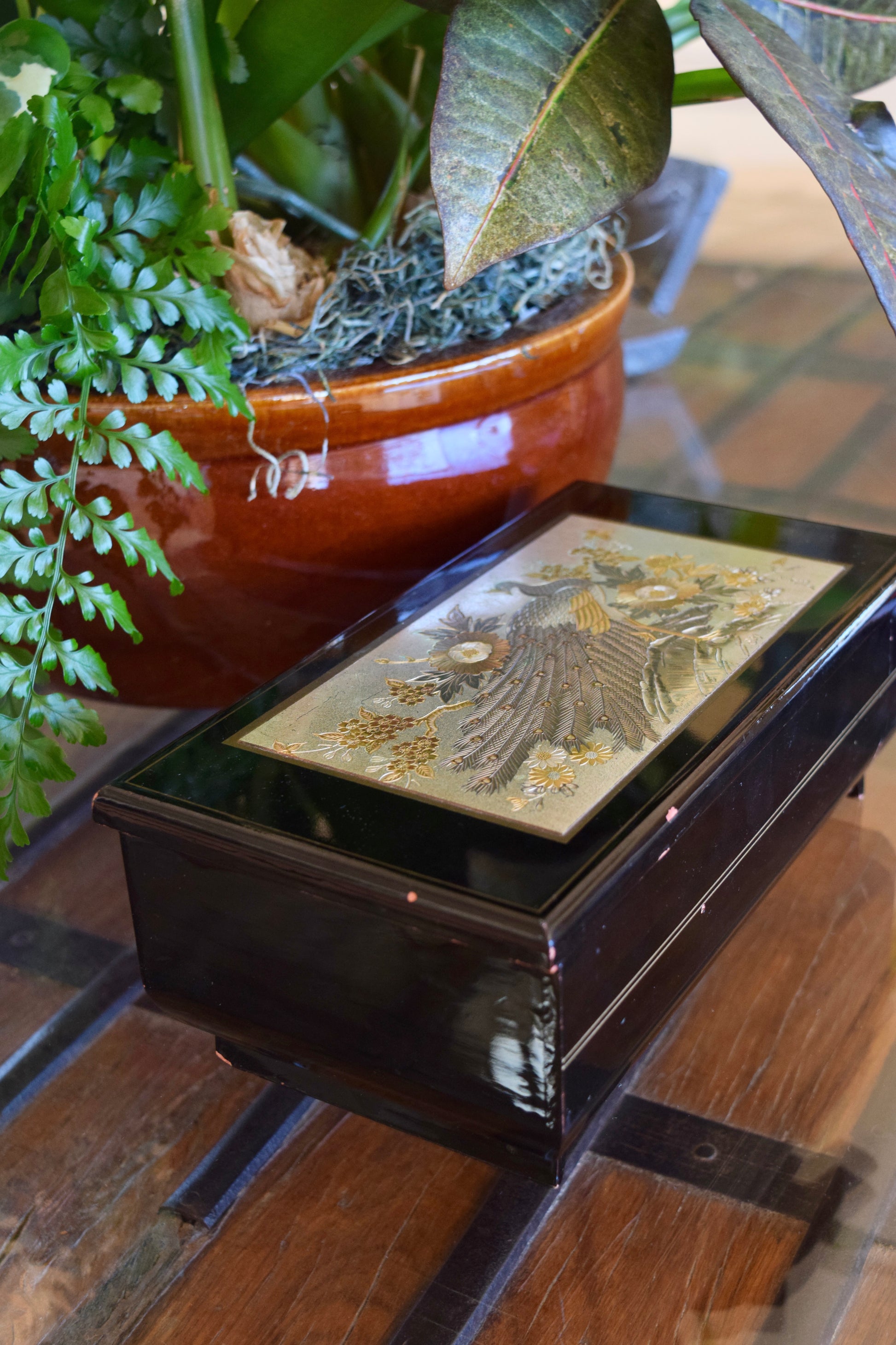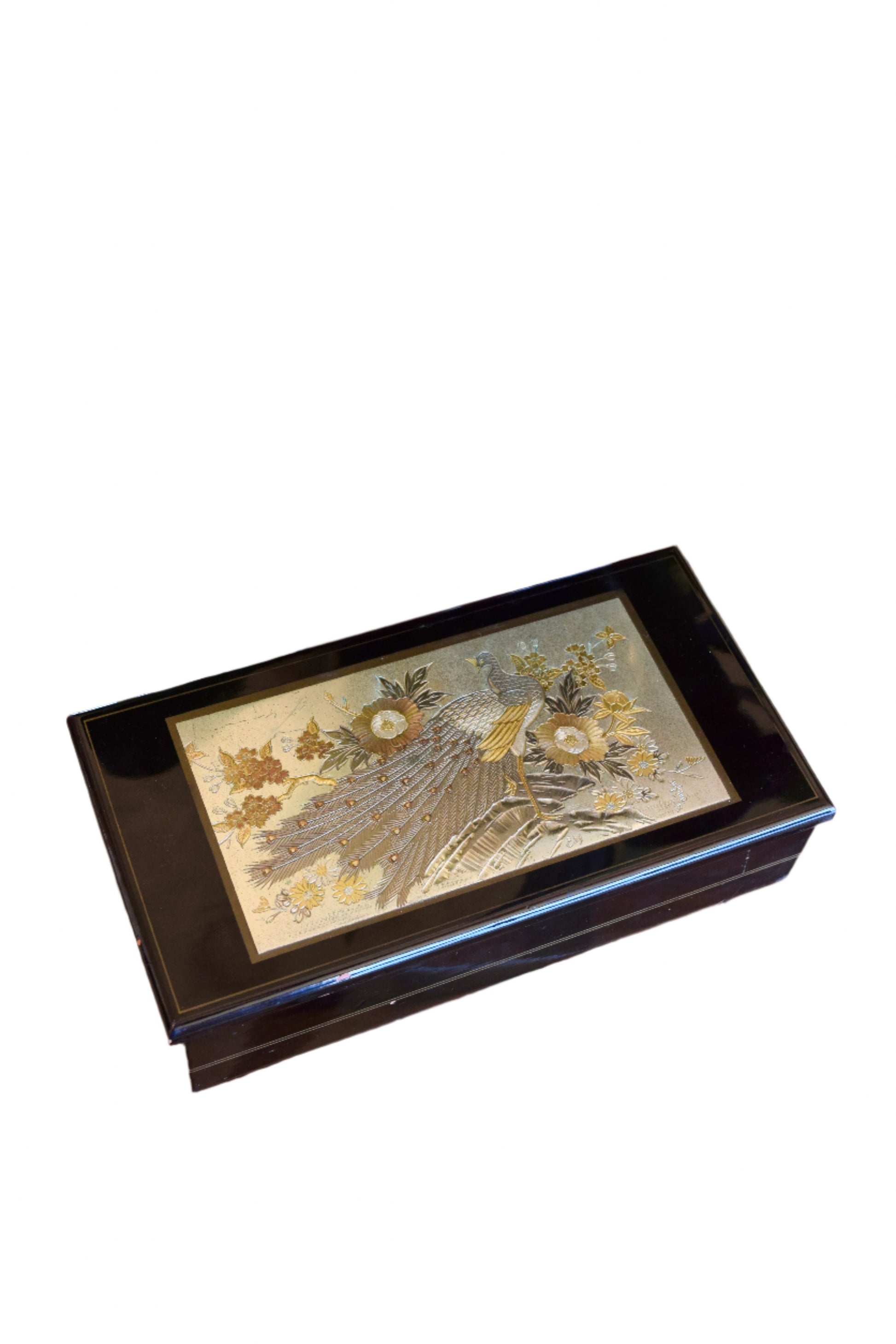 A limited edition musical box showcasing the traditional Japanese art of Chokin by master artist Yoshinobu Hara. The piece features an intricately etched peacock design executed in silver and gold on copper, demonstrating the sophisticated metalworking techniques passed down through generations.