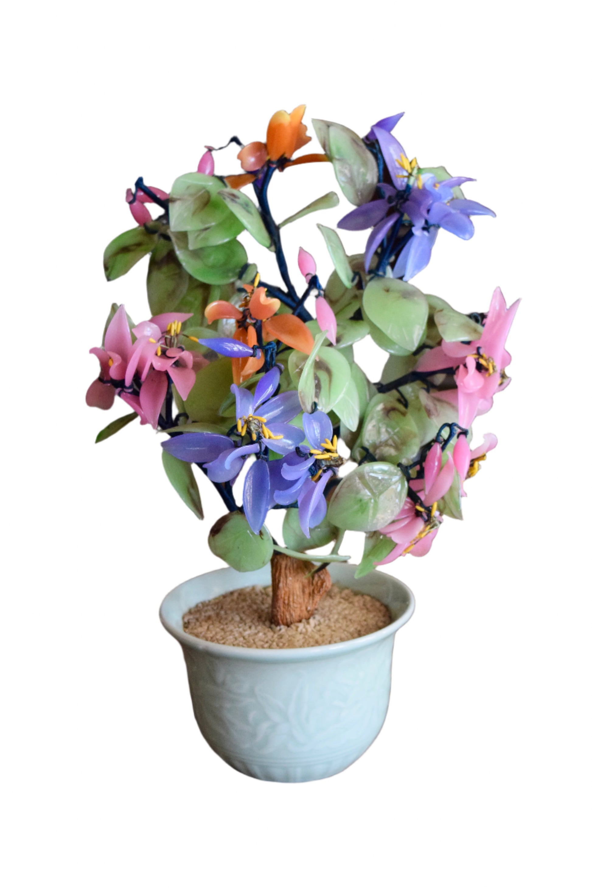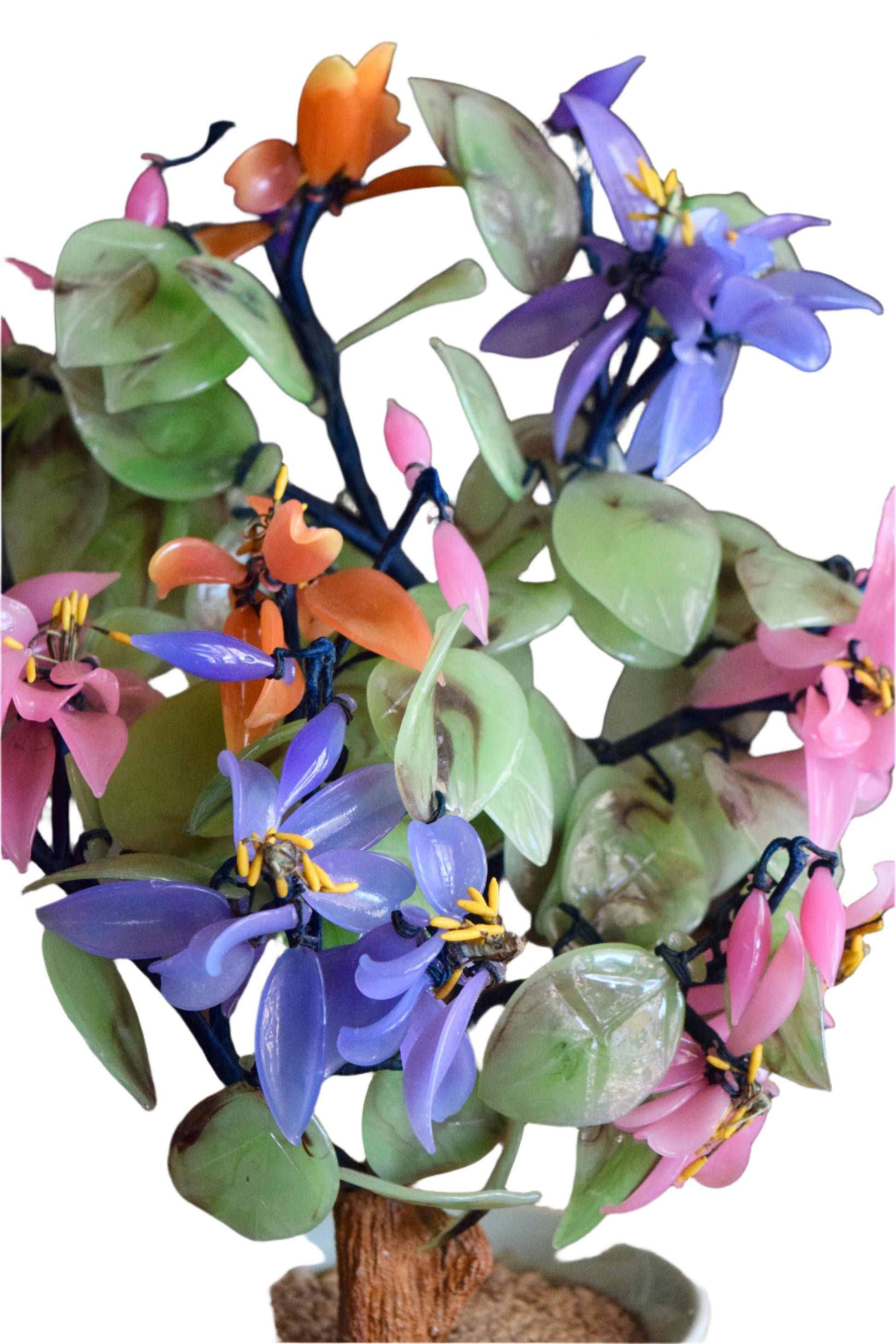 This piece represents the Chinese glass art tradition that flourished in the mid-20th century, particularly for export markets. These decorative trees combined traditional Chinese artistic principles with modern materials, becoming popular in Western households during the post-war period's fascination with Asian decorative arts.