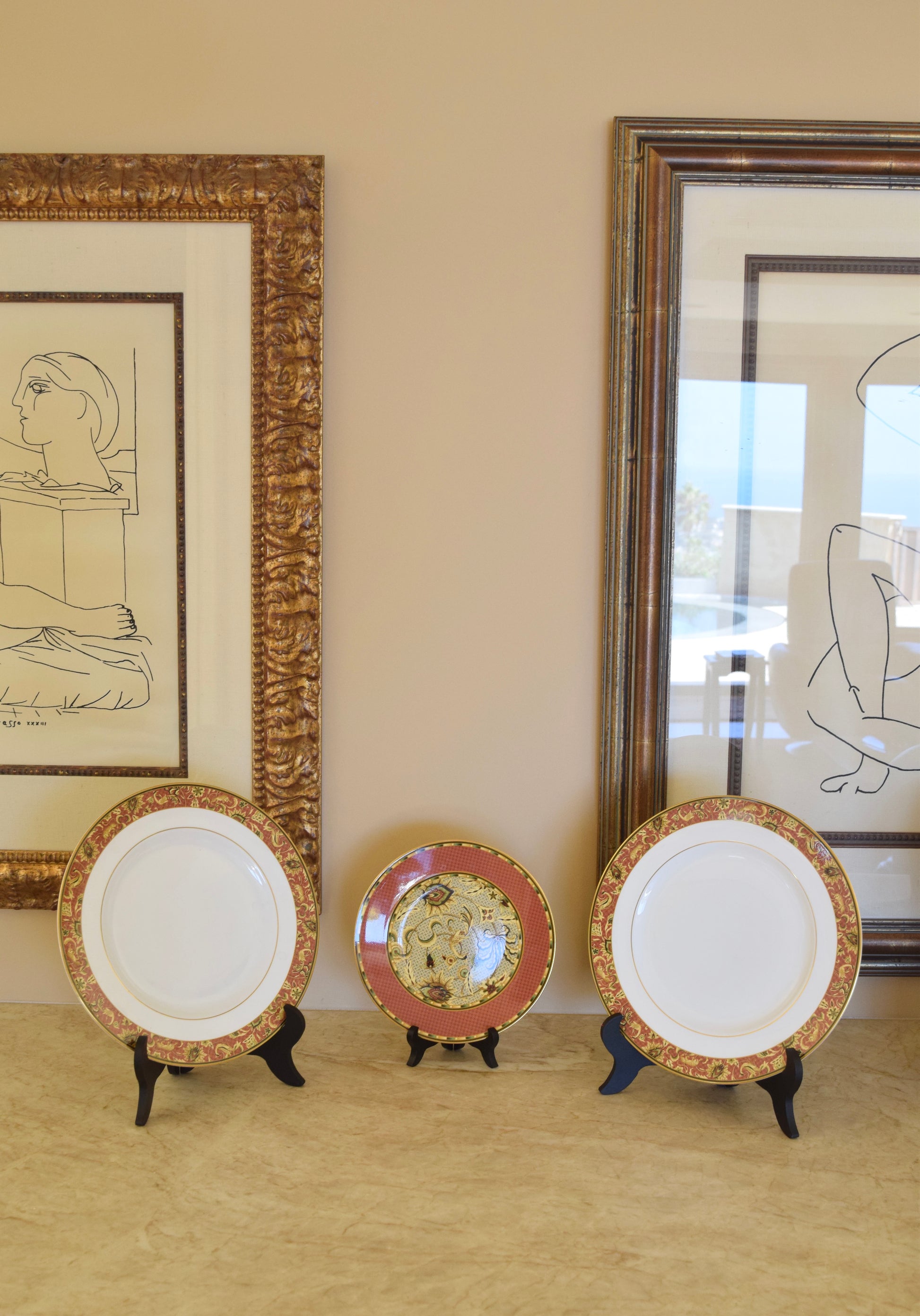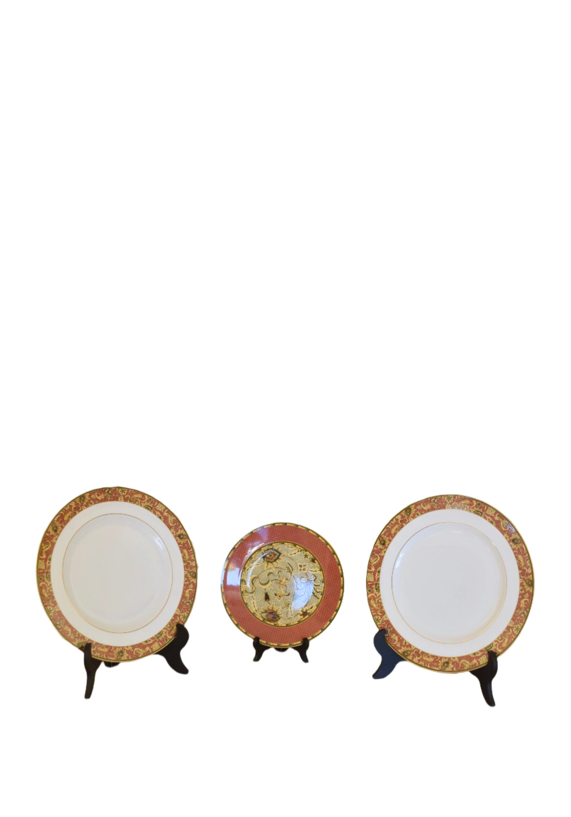 A coordinated set of Wedgwood bone china plates in the elegant Persia pattern, including two dinner plates and one salad plate. This sophisticated design features a rich Persian-inspired border in warm rose and gold tones.